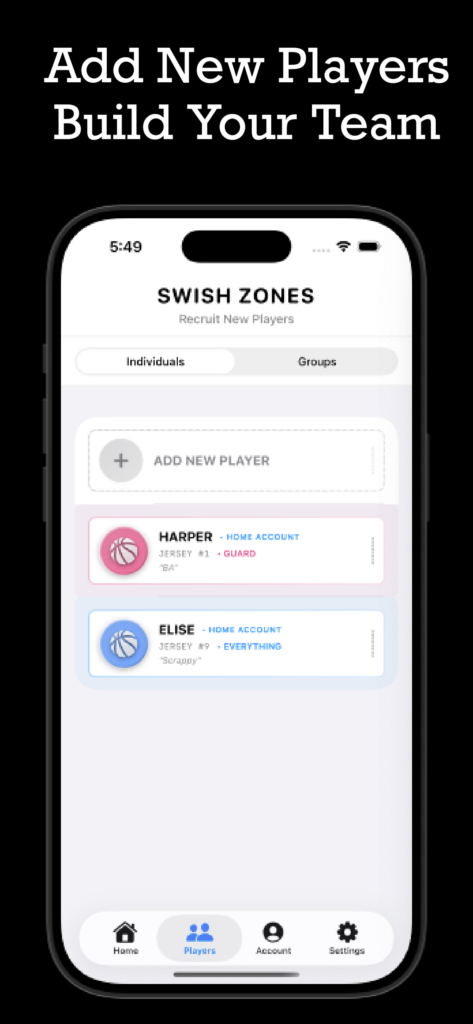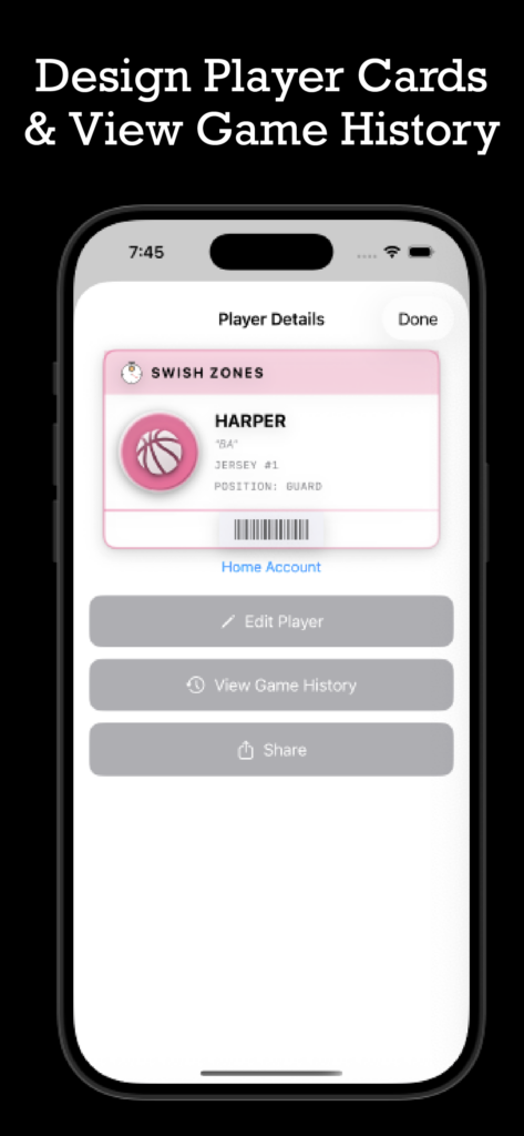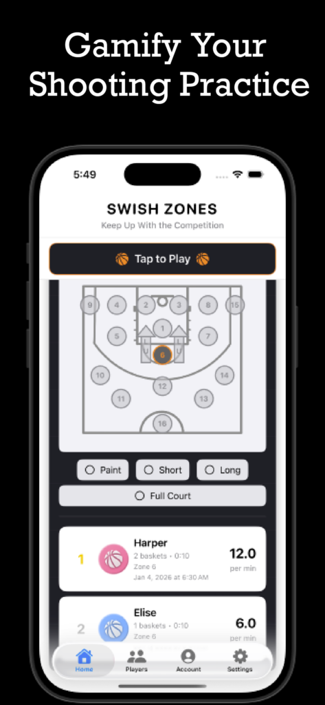 Swish Zones helps you track shooting practice and improve your game. Whether you’re practicing solo or with friends and family, track your progress and compete to become a Play Maker.